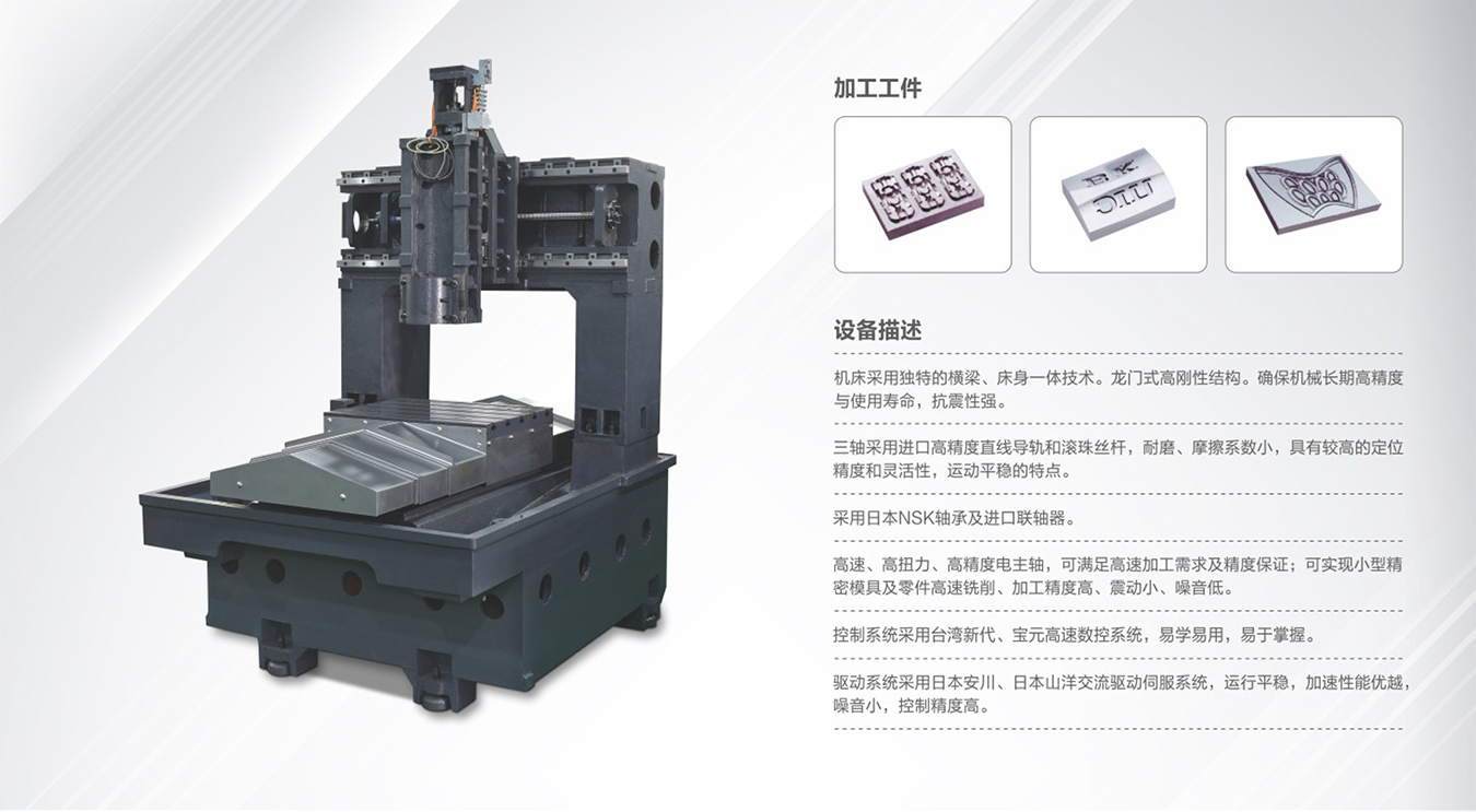 新型環(huán)保數(shù)控CNC -高速雕銑機(jī)采用高速24000-48000轉(zhuǎn)電主軸,選配靜電式油霧凈化器,三軸采用線性導(dǎo)軌,速度快,精度高,是模具、電極、批量零件加工;采用臺灣新代或臺灣寶元控制系統(tǒng),日本YASKWA電機(jī)及驅(qū)動,臺灣上銀、銀泰導(dǎo)軌及滾珠絲桿,華雕精密主軸,是高轉(zhuǎn)速、高移動速度的結(jié)合。